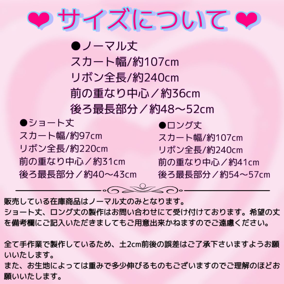 ハンドメイドで1点ずつ手作りしております。スカート丈等、約2㎝前後の誤差はご了承ください。